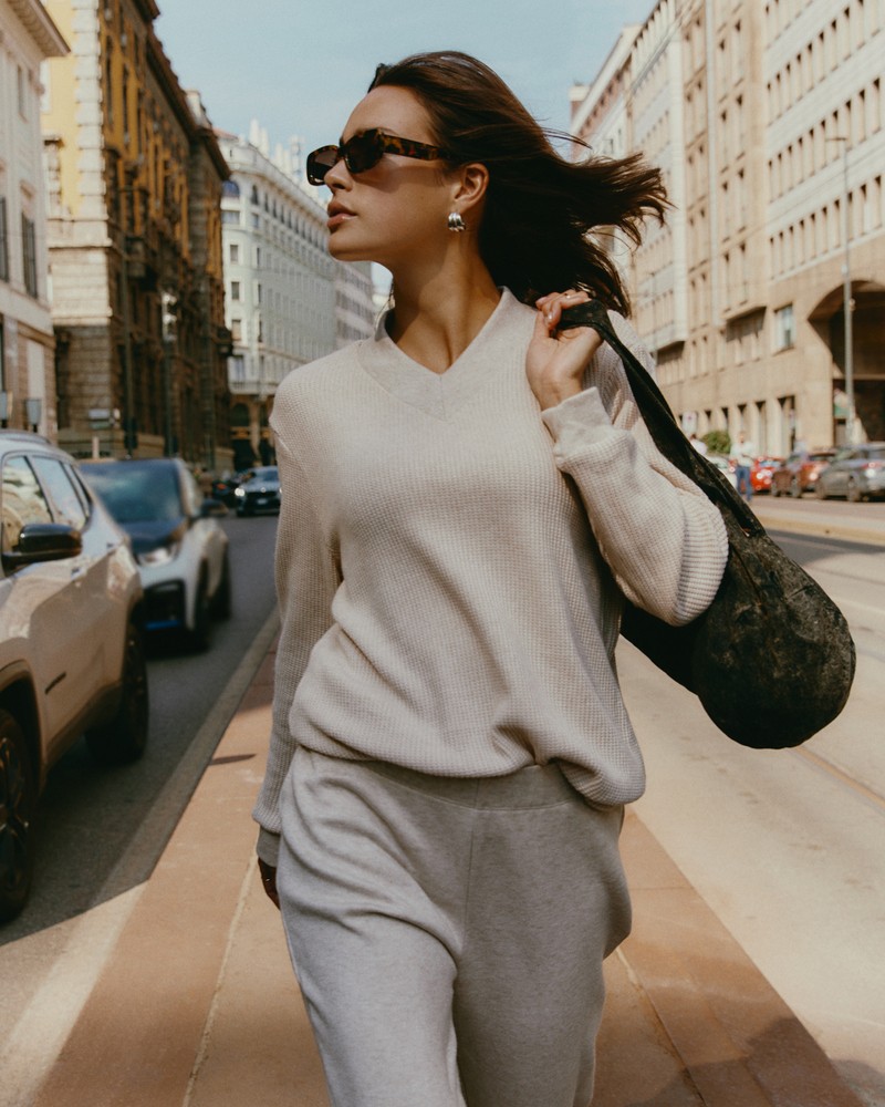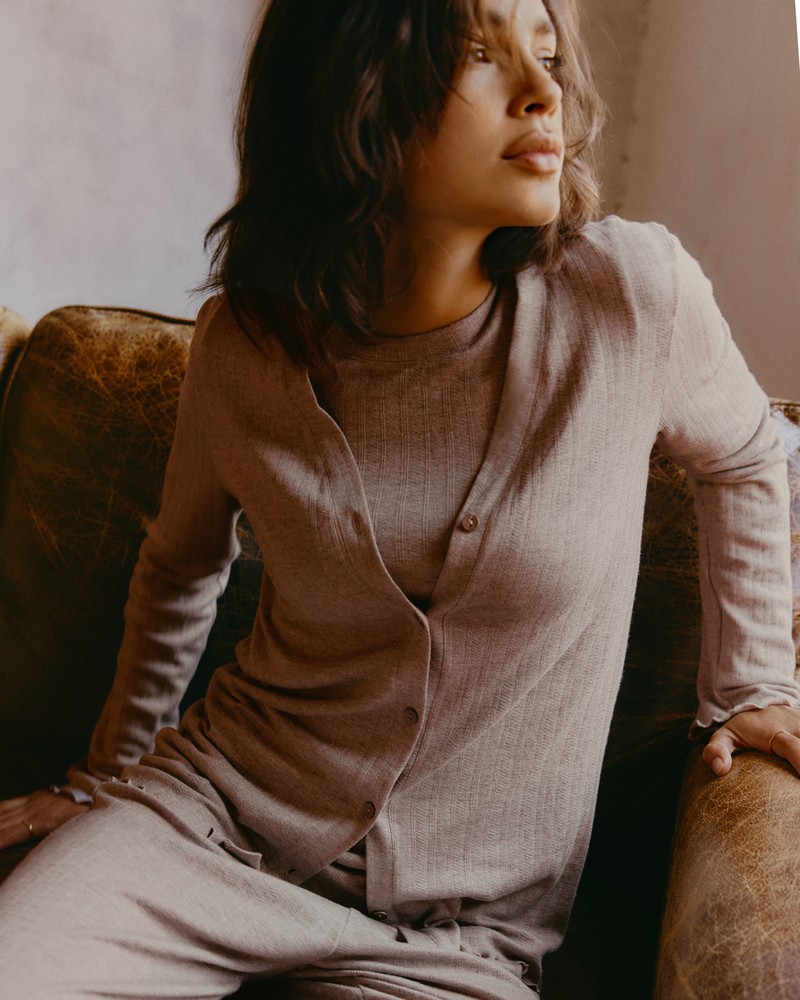 Η πρόταση ανοίγει με κομμάτια από modal cashmere που αγκαλιάζουν το σώμα σαν μια απαλή, ζεστή αγκαλιά. Το απλό και εκλεπτυσμένο πουλόβερ με στρογγυλή λαιμόκοψη συνδυάζεται με την ζακέτα V-neck για να δημιουργηθεί ένα διακριτικό layered αποτέλεσμα, ενώ το παντελόνι διαθέσιμο σε εκδοχή με λάστιχο στον αστράγαλο ή σε palazzo γραμμή, επιτρέπει την επιλογή ανάμεσα στην πρακτικότητα και την αέρινη κίνηση. Η σειρά ολοκληρώνεται με το νυχτικό V-neck, το οποίο μετατρέπεται σε ένα κομψό lounge.