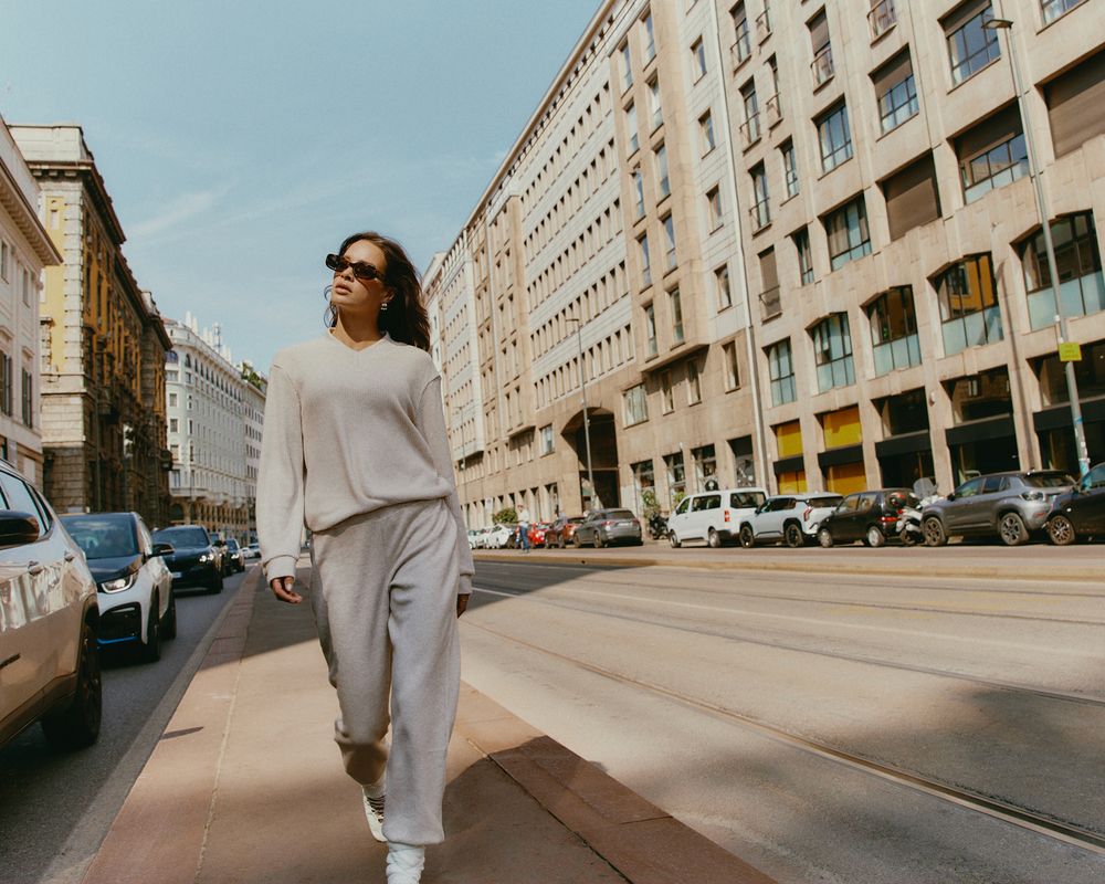 Ακολουθεί η επιλογή από modal wool με contrasting προφίλ, όπου η απαλότητα του υφάσματος συναντά μοντέρνες λεπτομέρειες. Το πουλόβερ με στρογγυλή λαιμόκοψη είναι εφαρμοστό και ιδανικό είτε για προσωπικές στιγμές είτε για να φορεθεί κάτω από παλτό τις πρώτες κρύες μέρες, ενώ το παντελόνι σε ίσια γραμμή με στρογγυλεμένες άκρες αναδεικνύει τη σιλουέτα και εξασφαλίζει ελευθερία κινήσεων.