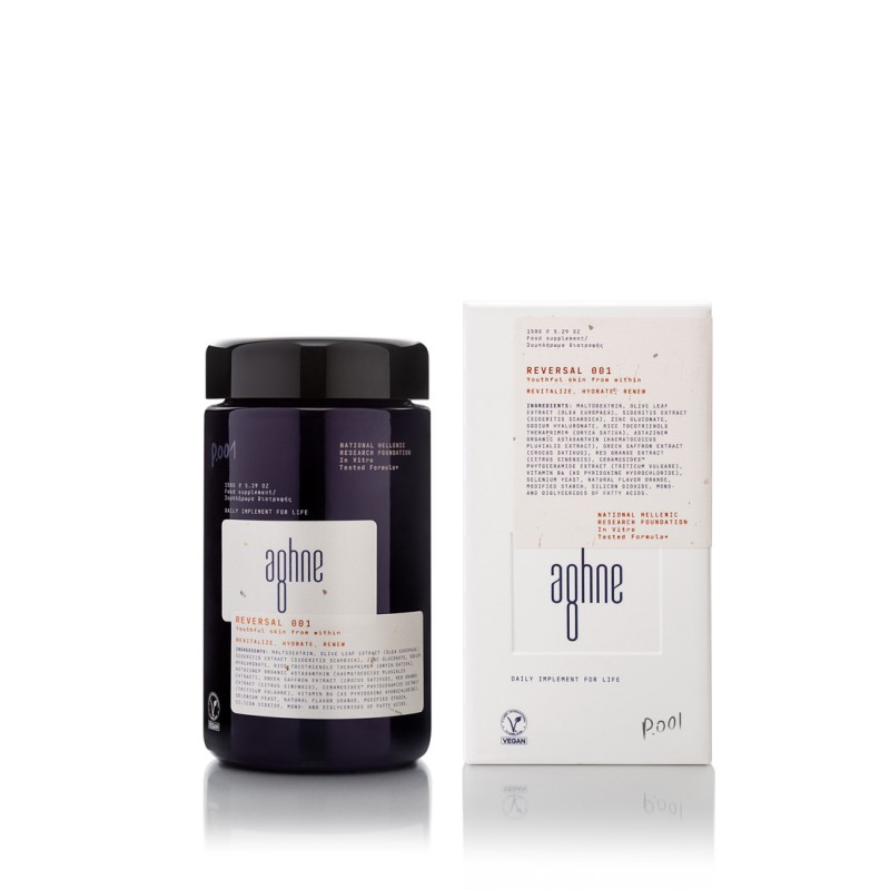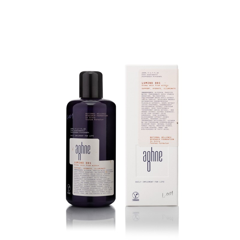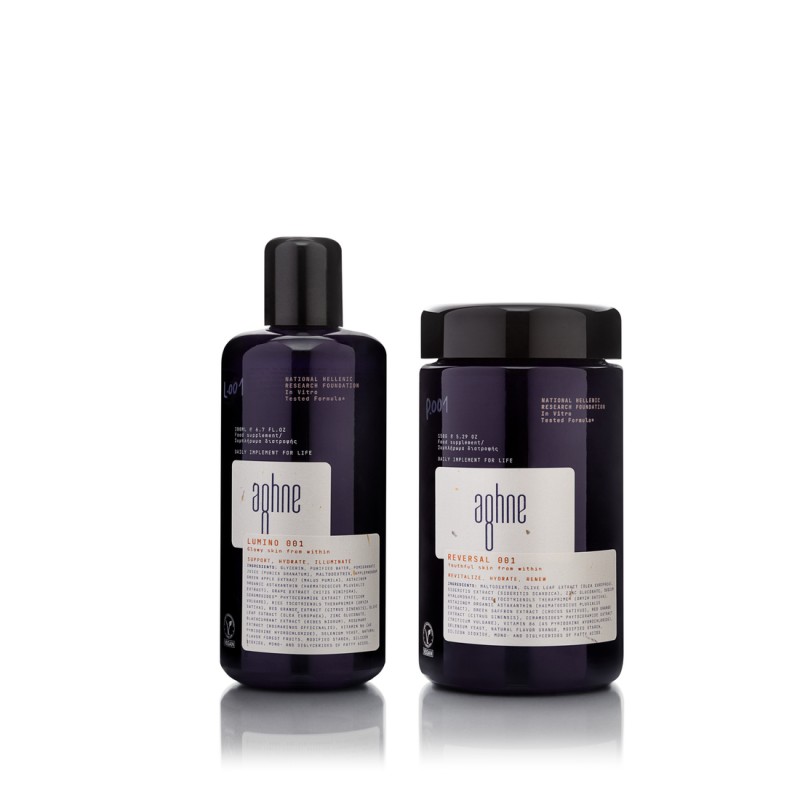 To ταξίδι της aghne ξεκινά με δύο πρωτοποριακά διατροφικά καλλυντικά, το LUMINO 001 και το REVERSAL 001, που καλύπτουν ολιστικά τις ανάγκες του δέρματος και εκφράζουν τη φιλοσοφία της μάρκας: ομορφιά, ενέργεια και ισορροπία εκ των έσω.